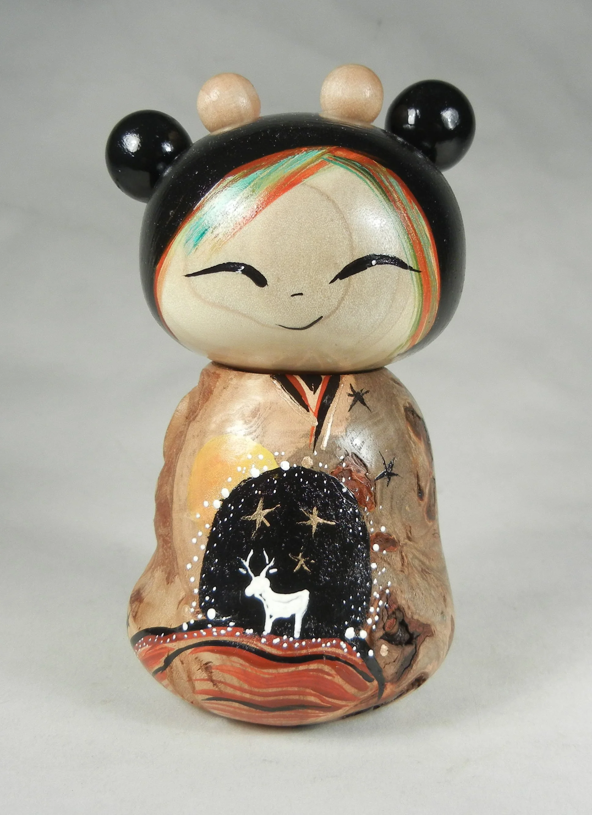 Looking for the natural movement of the wood, each Kokeshi doll is made with love by Jacob Hodsdon and Lisa Holt-Hodsdon from Ithaca, N.Y. Lisa specializes in painting and design, influenced by her travels and from American and Japanese cultures. Jacob has been wood turning for many years and draws his inspiration from nature and the beauty of wood. The Hodsdons have recently been featured in the Art Doll Quarterly Magazine!